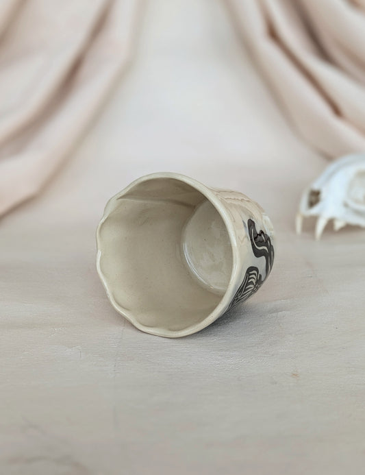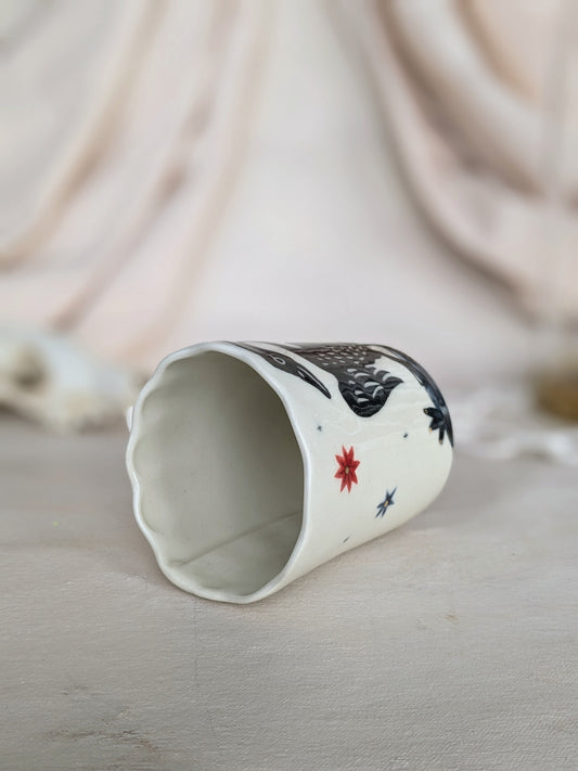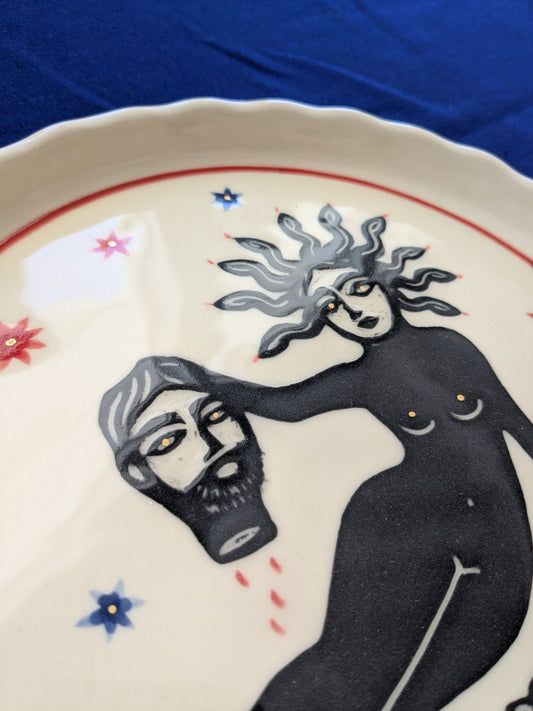 Mes pièces sont fabriquées en petites séries avec la technique du modelage à la plaque. Chaque pièce est unique et fabriquée à la main avec lenteur et attention. Comme tout objet de conception artisanale, elles peuvent avoir de petites imperfections ou comme des petites rugosités ou aspérités qui les distingue des objets industriels et fait leur charme. Les couleurs et les motifs peuvent varier légèrement. Chaque pièce est cuite trois fois, la dernière fois pour appliquer le lustre or 22 carat.