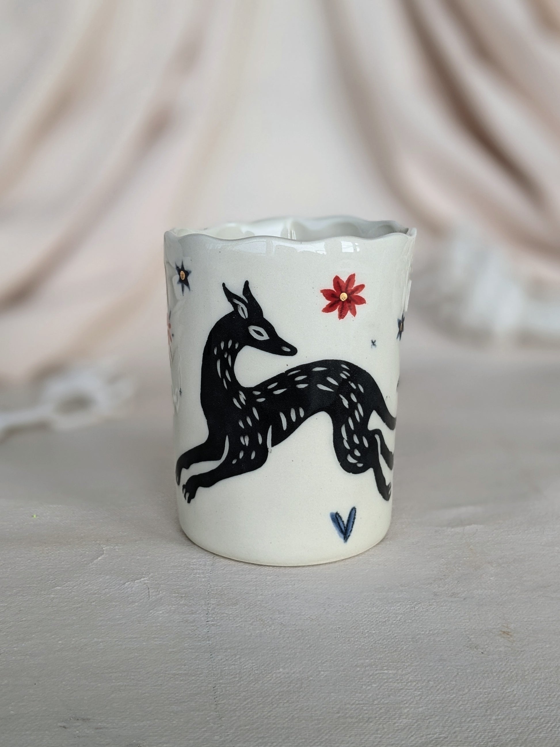 Large hand-made stoneware glass, decorated with underglazes, engobes and oxides and enhanced with real 22 carat gold lustre. Holds 300 ml.