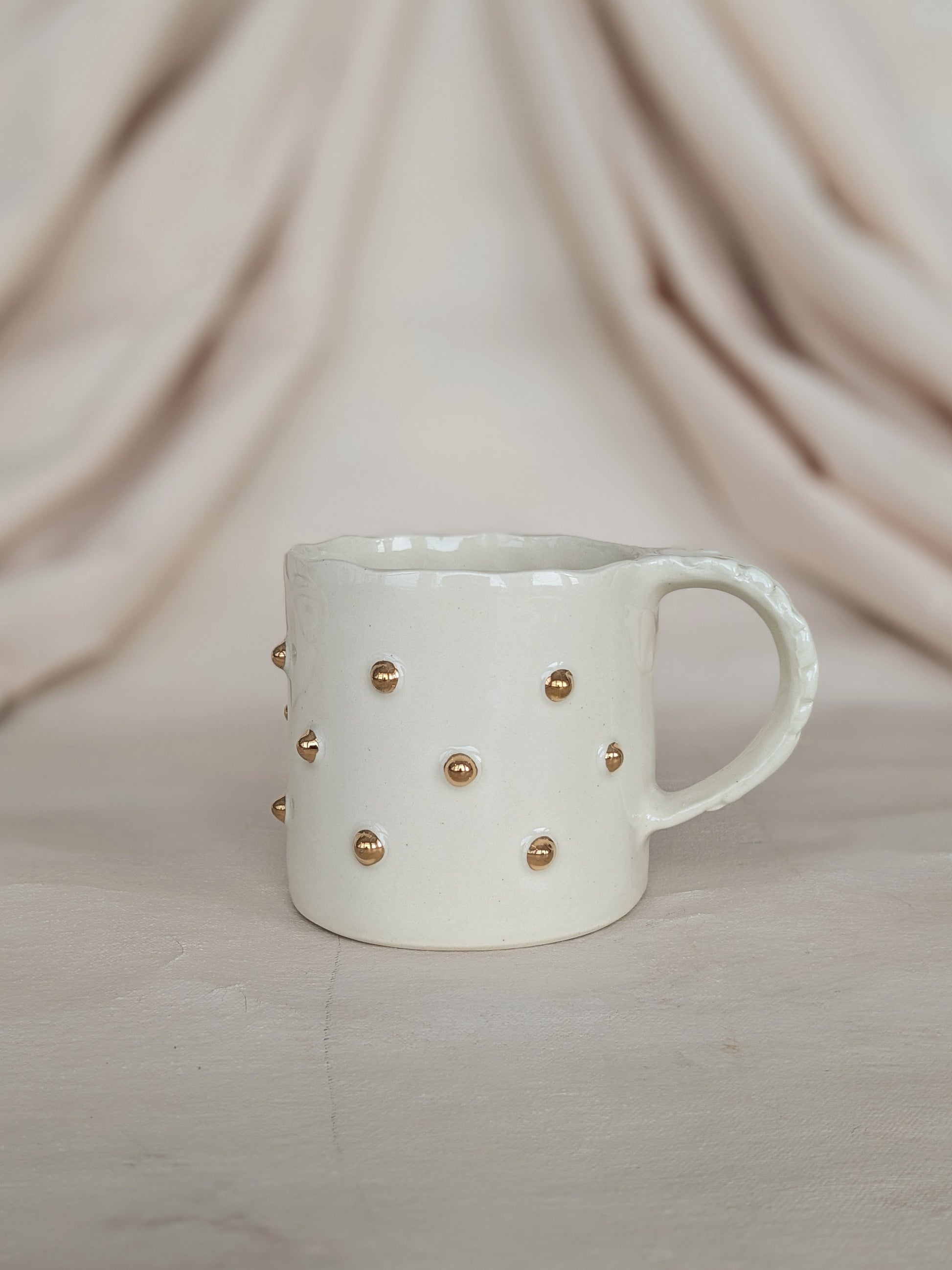 Large hand-made stoneware or porcelain mug, decorated with underglazes, engobes and oxides and enhanced with real 22 carat gold lustre. Holds 375 ml.