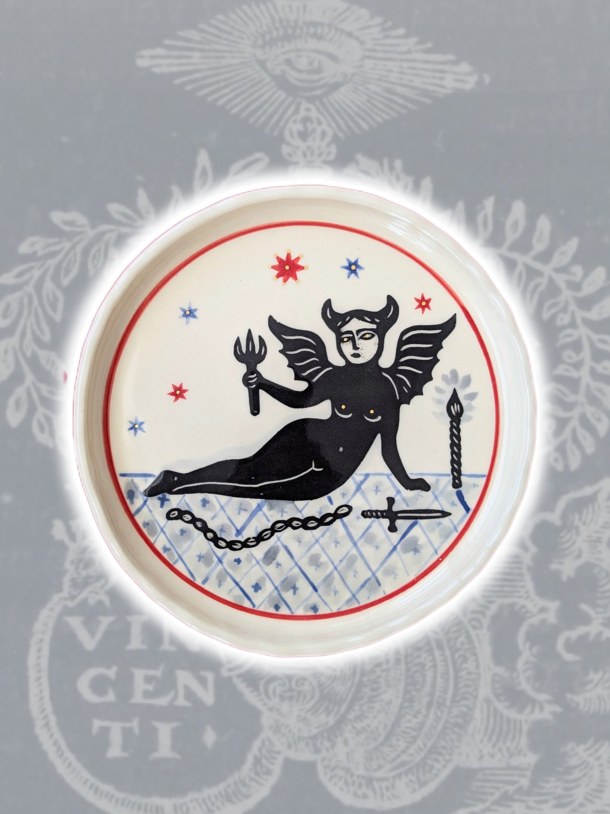 Small hand-made stoneware plate, decorated with underglazes, engobes and oxides.